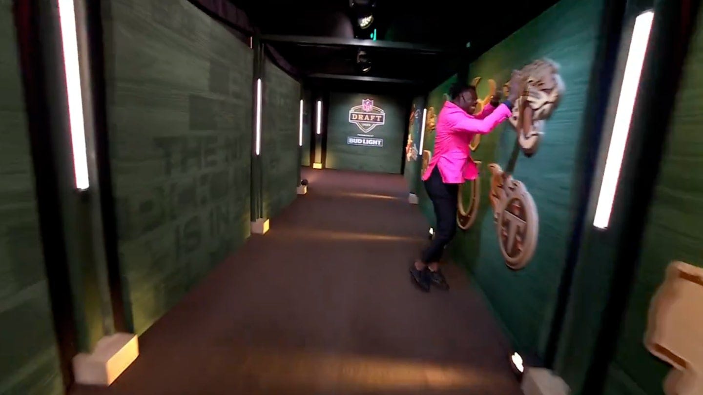 Last year in Green Bay, Hunter, the second overall pick, walked past the artwork and just slapped it. Not a tap. A real slap. Five minutes later, the CMO of the NFL pulled Ike aside and told him every player in the green room was talking about slapping their team’s logo. Something like this had never happened before. A spontaneous, unscripted moment that turned into an instant tradition.