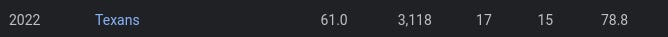 The 2022 Texans were a disaster. Their record was 3-13-1 with defeats and defeats and defeats. Their only 3 wins were all divisional opponents, by only a slight margin.